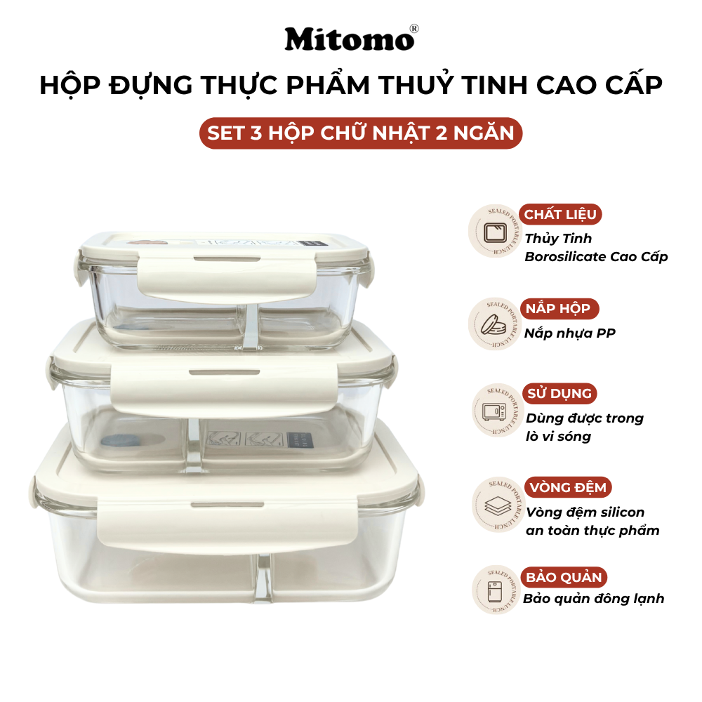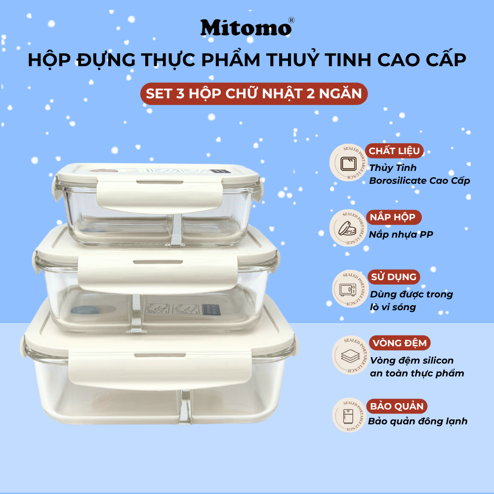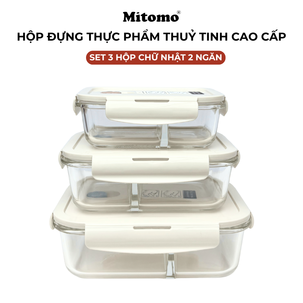 GIỚI THIỆU CHUNG BỘ 3 HỘP THUỶ TINH HÌNH CHỮ NHẬT 2 NGĂN ĐỰNG THỰC PHẨM MITOMO - ĐA NĂNG, CHỊU NHIỆT TỐT, AN TOÀN TUYỆT ĐỐI