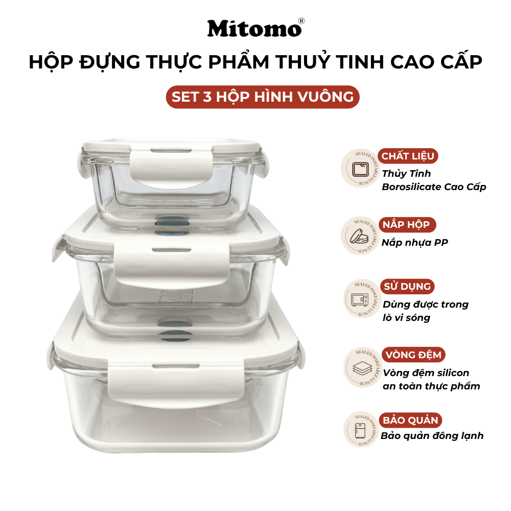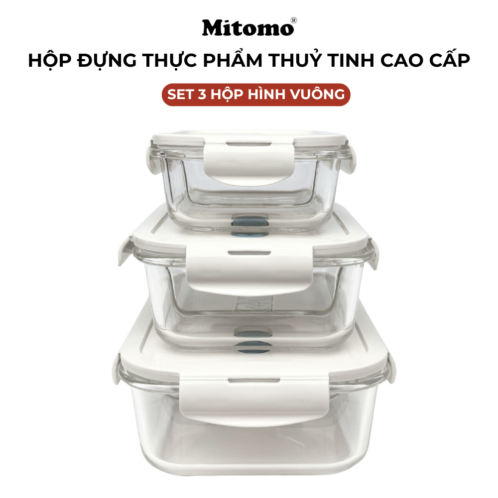 Bộ 3 hộp thuỷ tinh hình vuông Mitomo được dùng để lưu trữ, bảo quản thực phẩm khô, thực phẩm tươi sống hay thực phẩm chín.