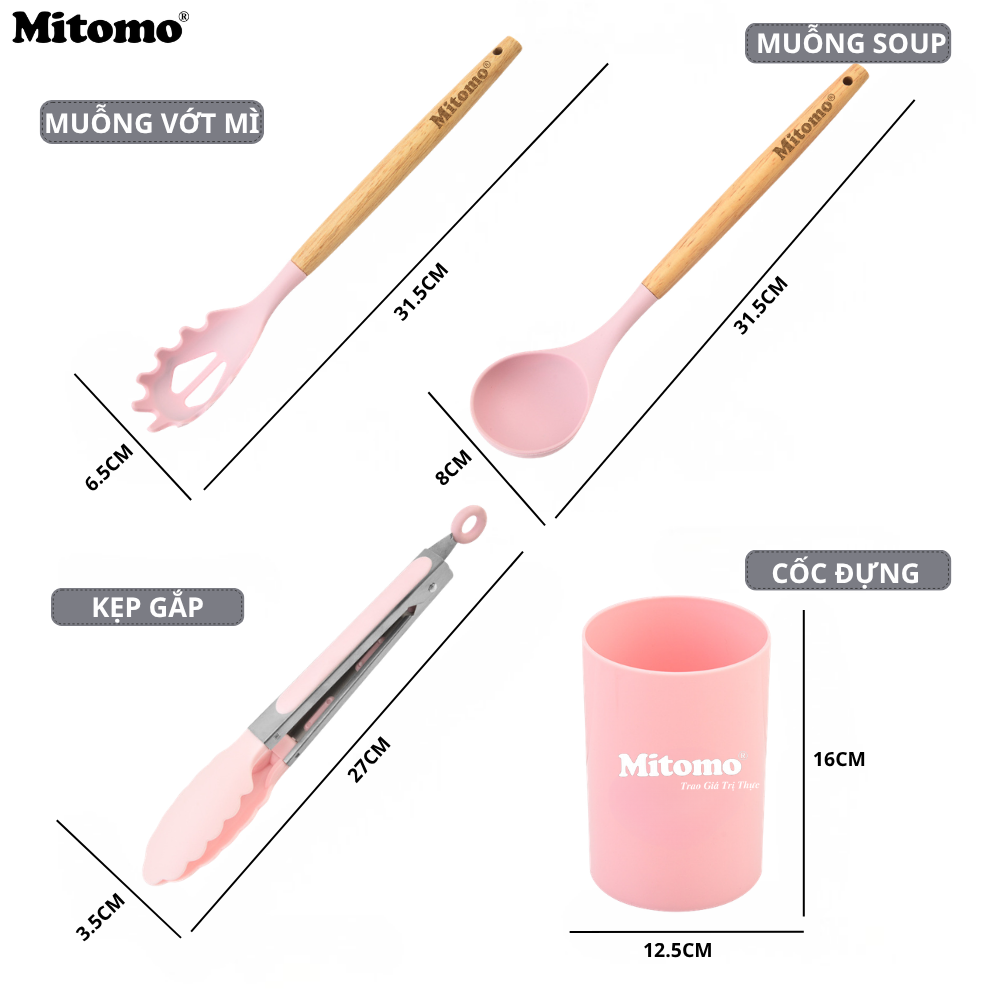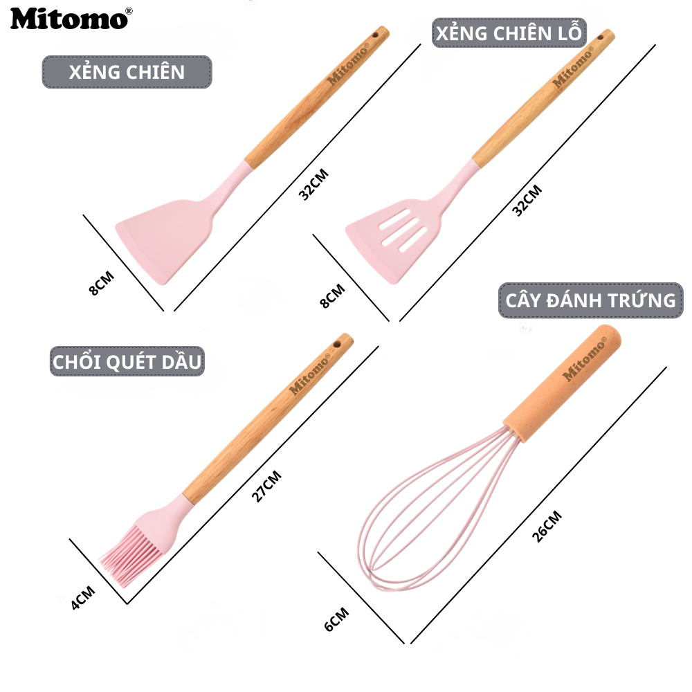 THÔNG SỐ KỸ THUẬT BỘ DỤNG CỤ NẤU ĂN SILICONE CÁN GỖ 12 MÓN CHỊU NHIỆT ĐỘ CAO MITOMO