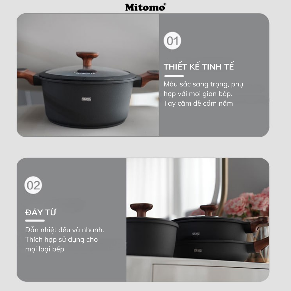 Đẳng cấp từ thiết kế đến chất liệu, bộ nồi chảo đá gốm cao cấp Mitomo DSP-CA009-S02-Black chính là lựa chọn hoàn hảo cho những ai yêu bếp, thích sự tiện nghi và thẩm mỹ.