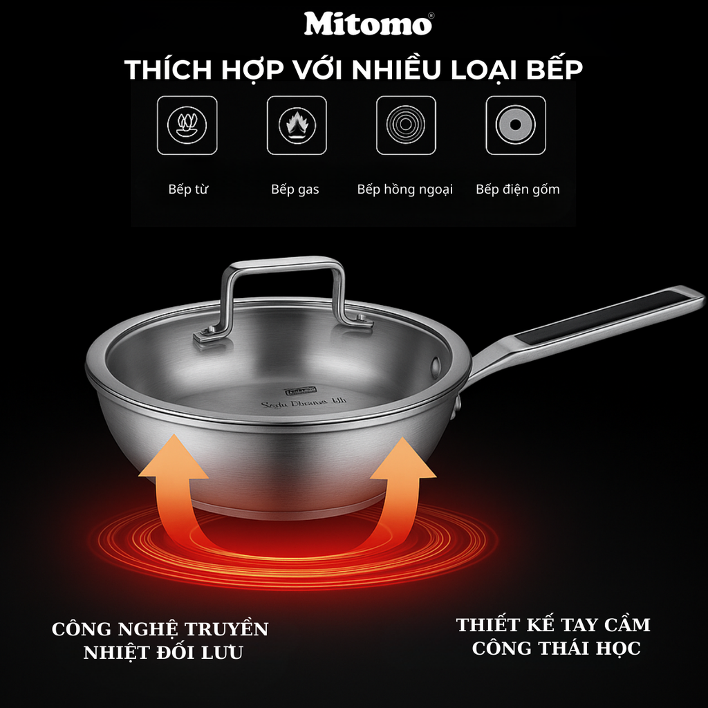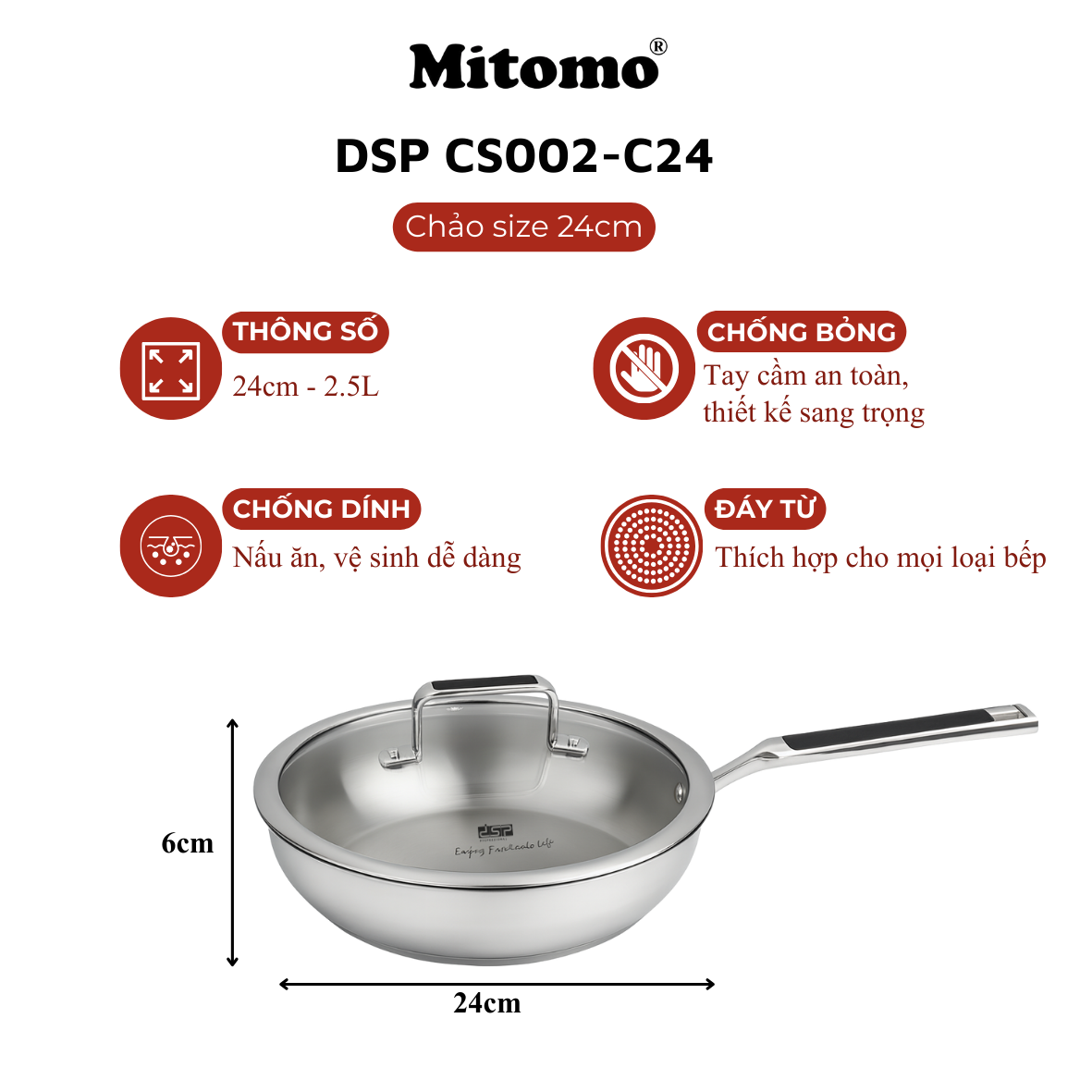 GIỚI THIỆU CHUNG CHẢO INOX CCAO CẤP MITOMO DSP CS002U-C24 - INOX 304 NGUYÊN KHỐI - CHỐNG DÍNH TỰ NHIÊN - ĐÁY TỪ 5 LỚP DẪN NHIỆT SIÊU NHANH