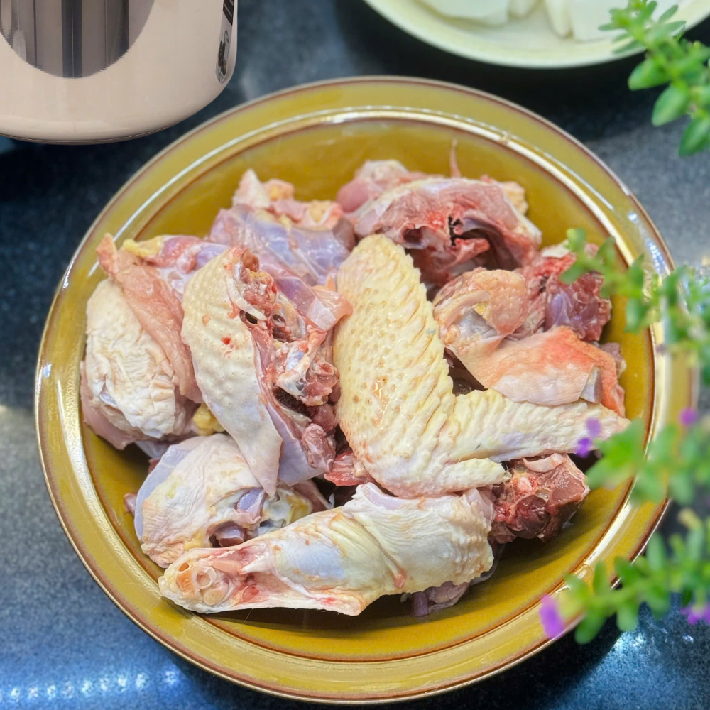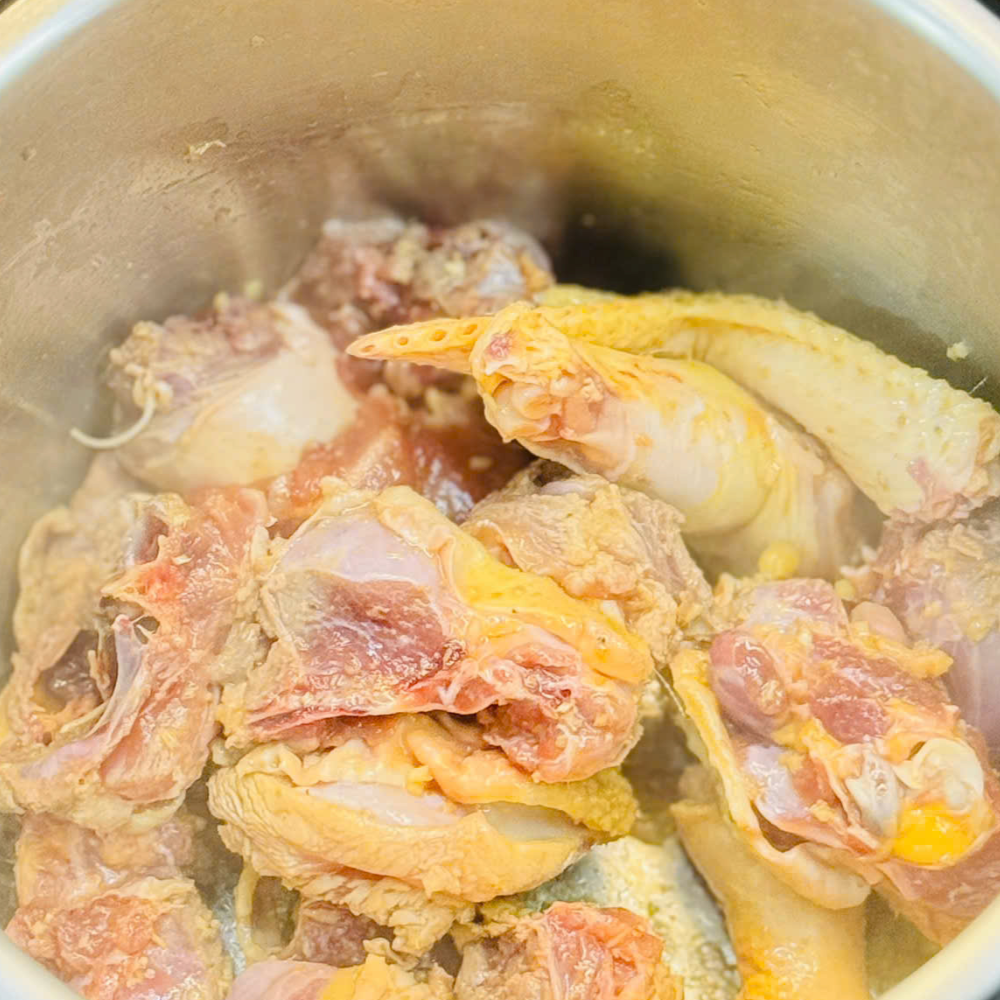 Làm sạch thịt gà và chặt thành khúc nhỏ. Ướp với một ít muốt, hạt nêm và tiêu vừa ăn trong khoảng 20 phút cho thấm gia vị.