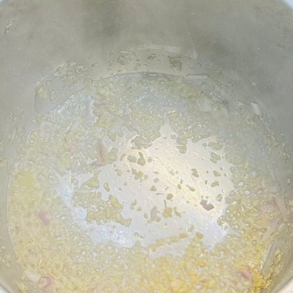 Đặt nồi áp suất Mitomo 304AEU lên bếp, bật lửa nhỏ, cho ít dầu ăn vào rồi phi thơm hành tím và tỏi băm.