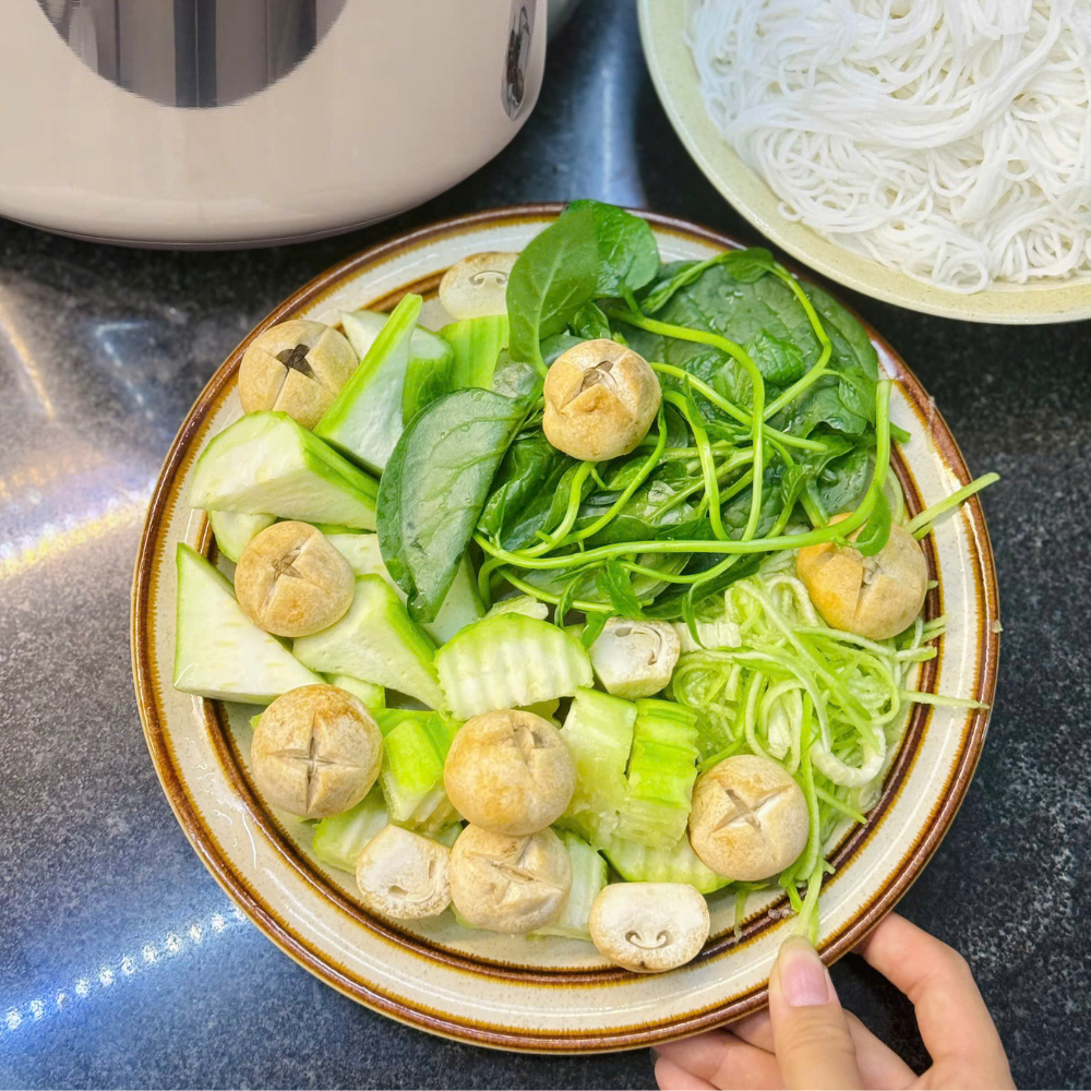 Mở nắp, cho thêm củ cải trắng, nấm rơm, mướp đã cắt khúc và rau mồng tơi vào, bật bếp nấu thêm khoảng 3–5 phút là hoàn thành.